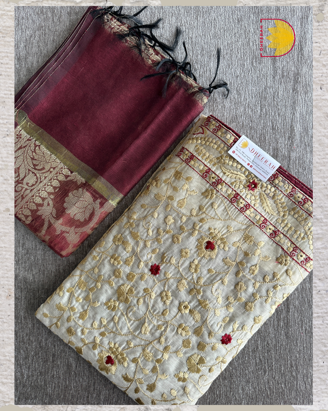 Banarasi Silk Cotton Fusion. Crafted from elegant silk cotton, this set is beautifully complemented by a traditional Banarasi dupatta