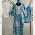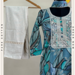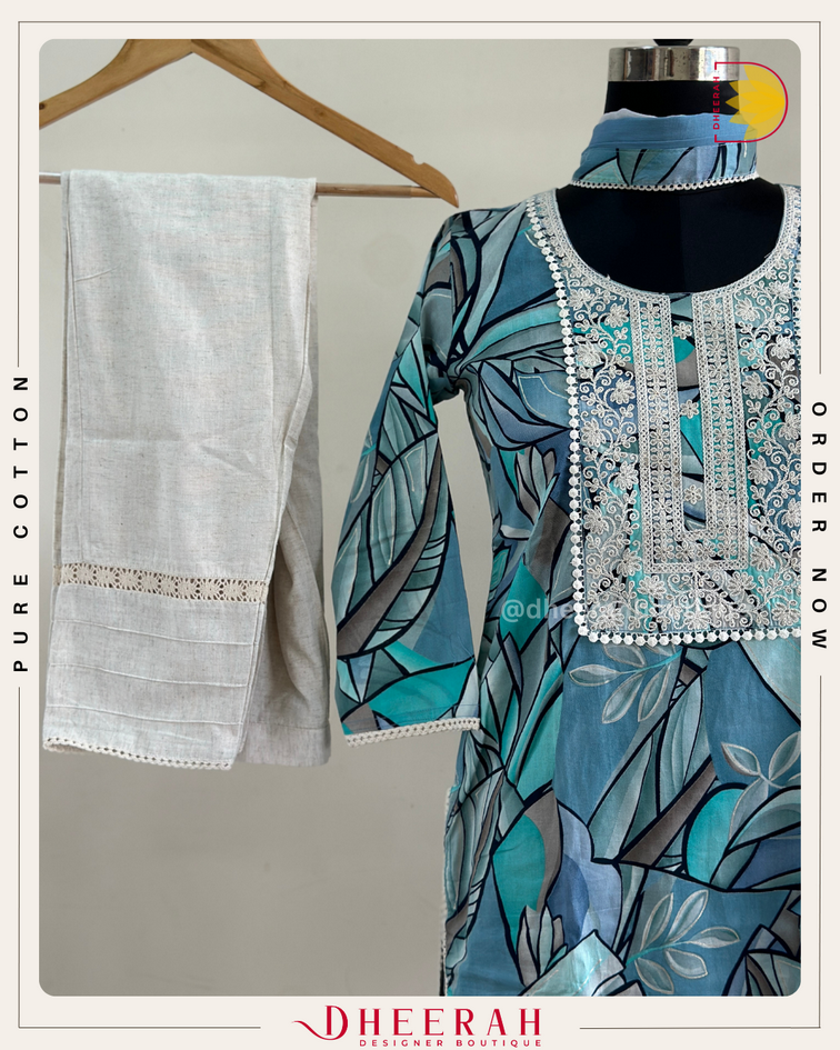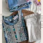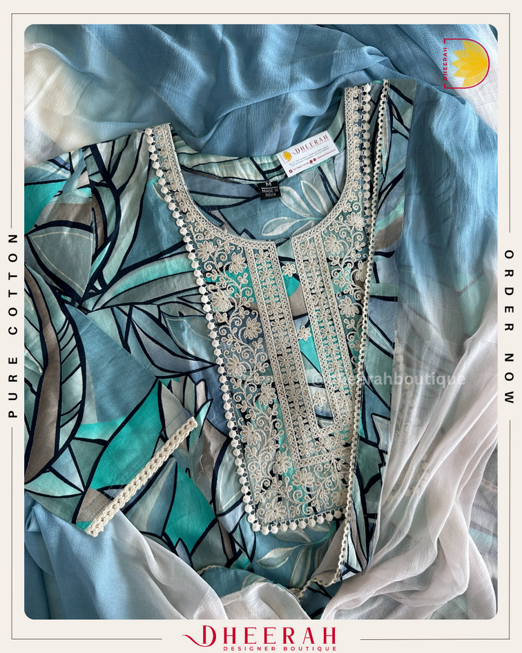 🦋 Premium kurta features a stunning digital print on soft muslin, with delicate thread work elevating the yoke. Paired with a flowy khadi bottom and a luxurious georgette dupatta embellished with borders and lace, it’s the perfect outfit for any occasion
