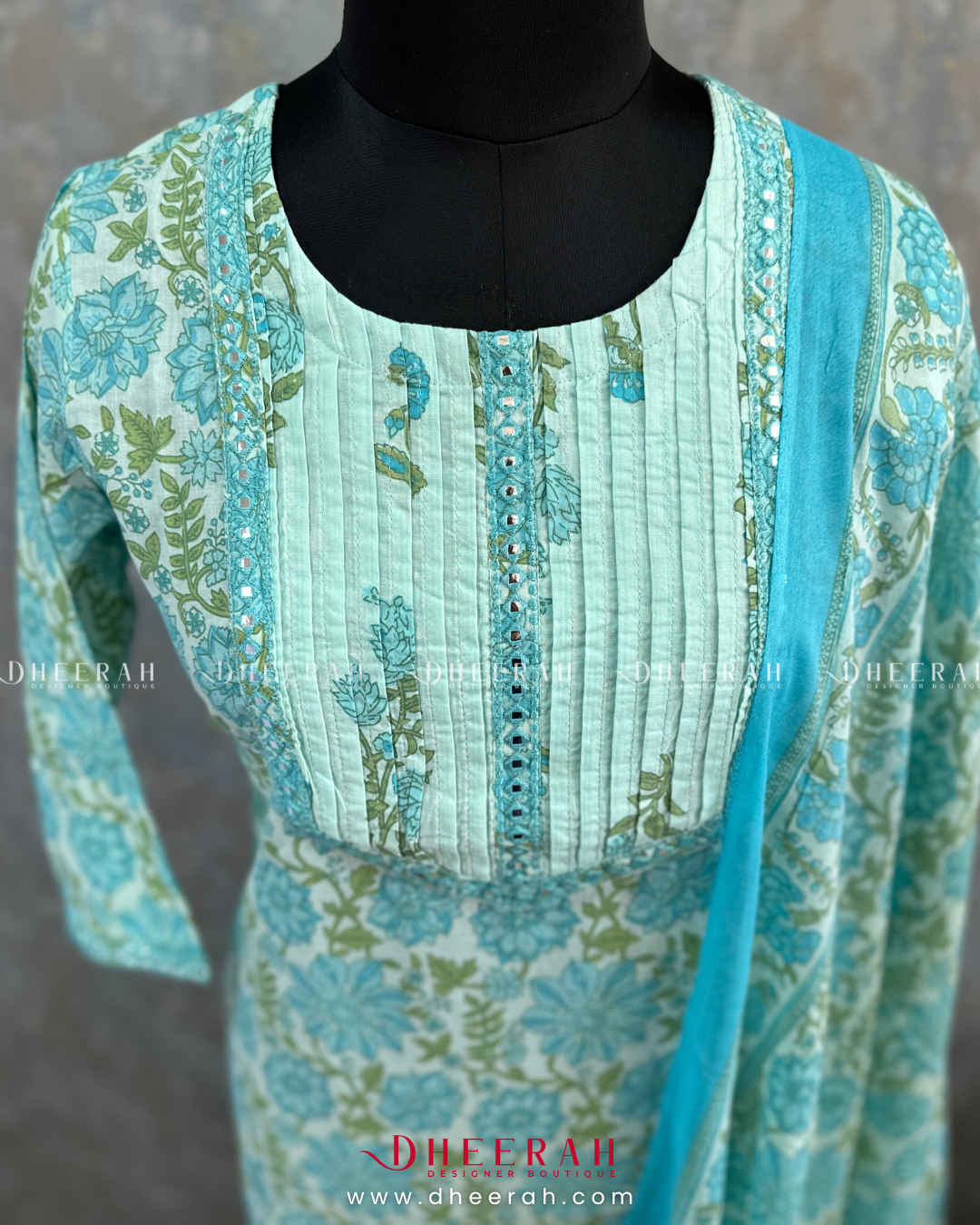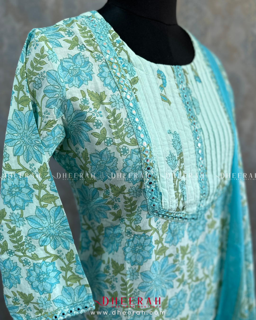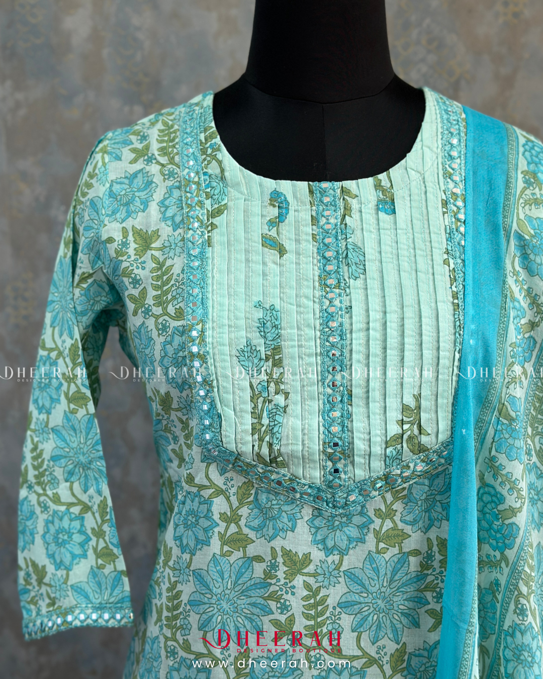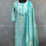 This pure cotton kurta showcases digital prints and pleated neck detailing, enhanced with foil mirror embroidery for a touch of shine. Paired with a comfortable cotton bottom and soft mul cotton dupatta, it’s a perfect blend of comfort and style.