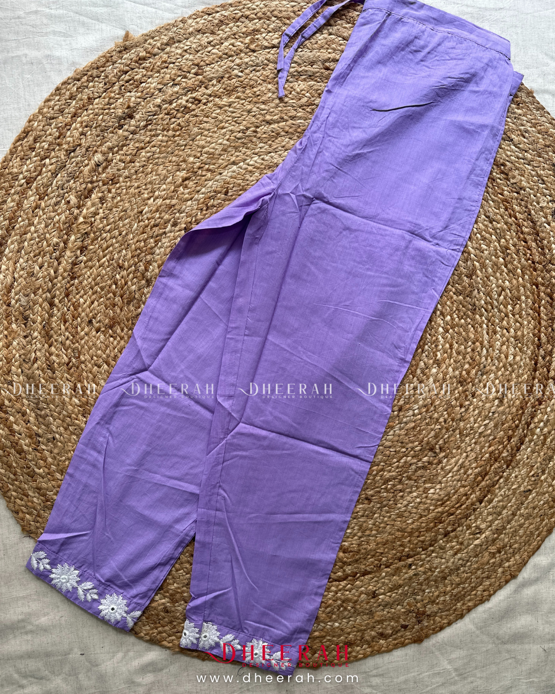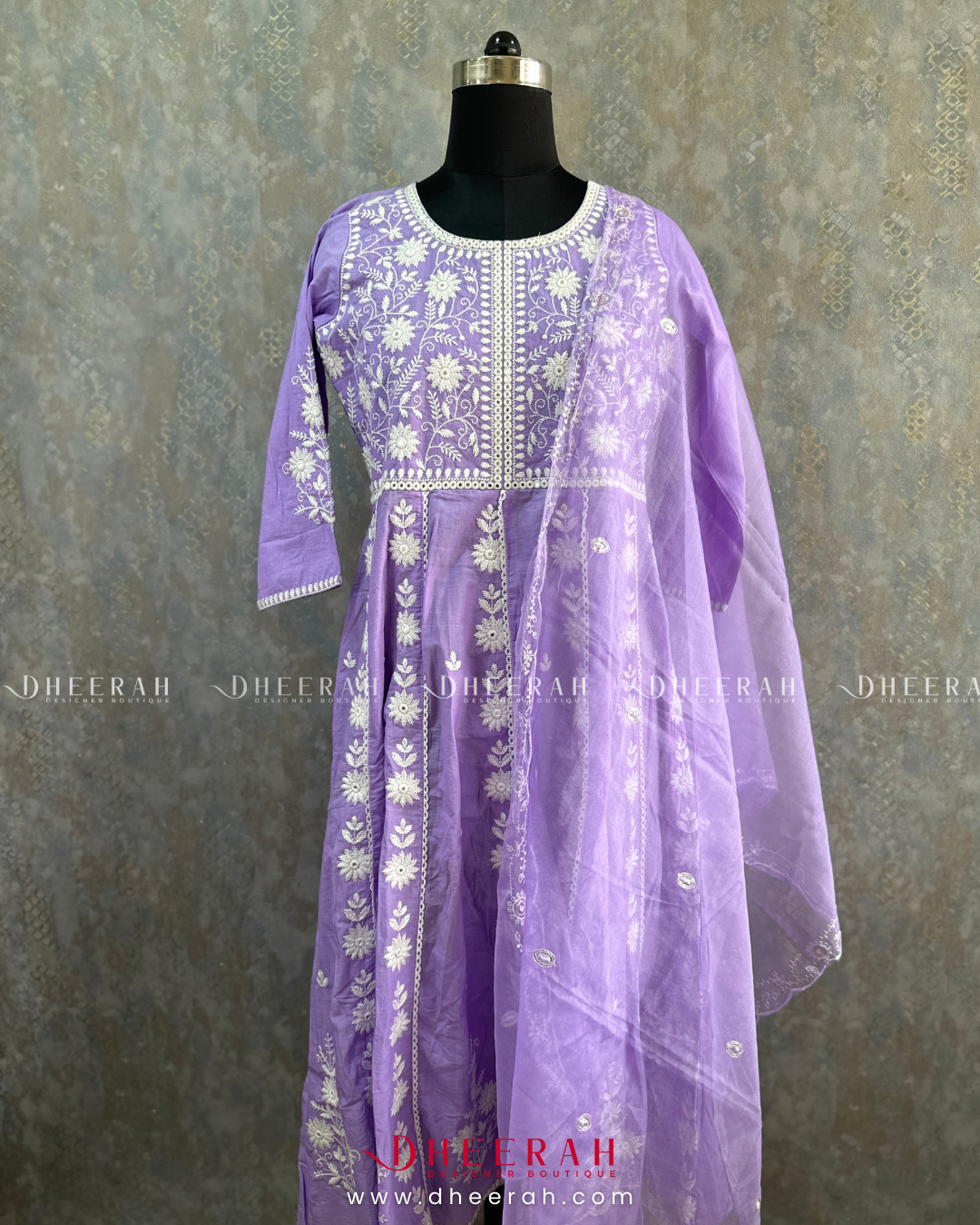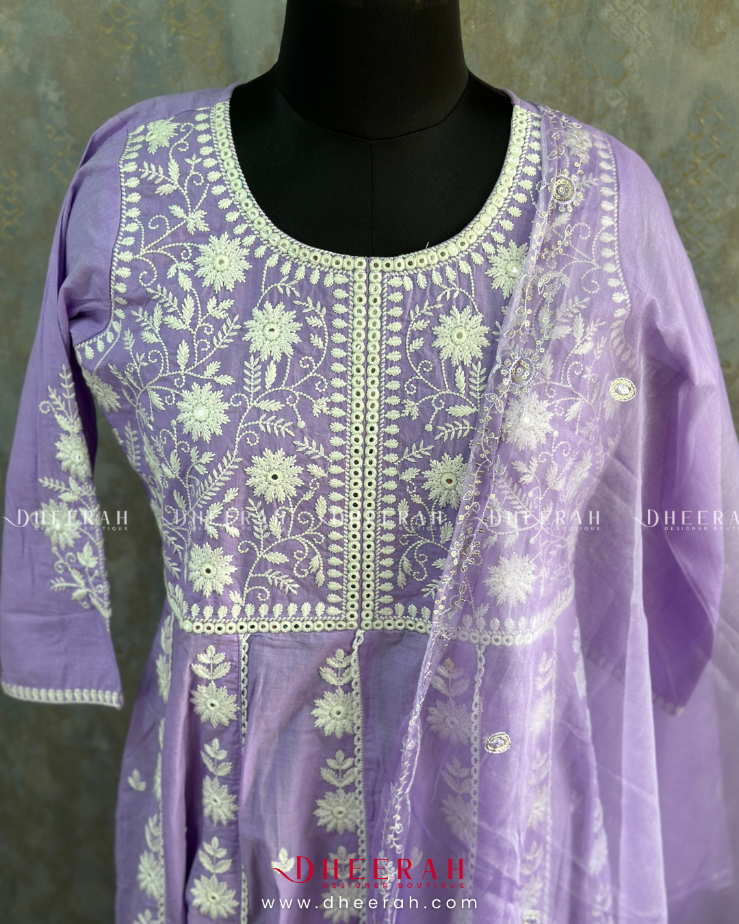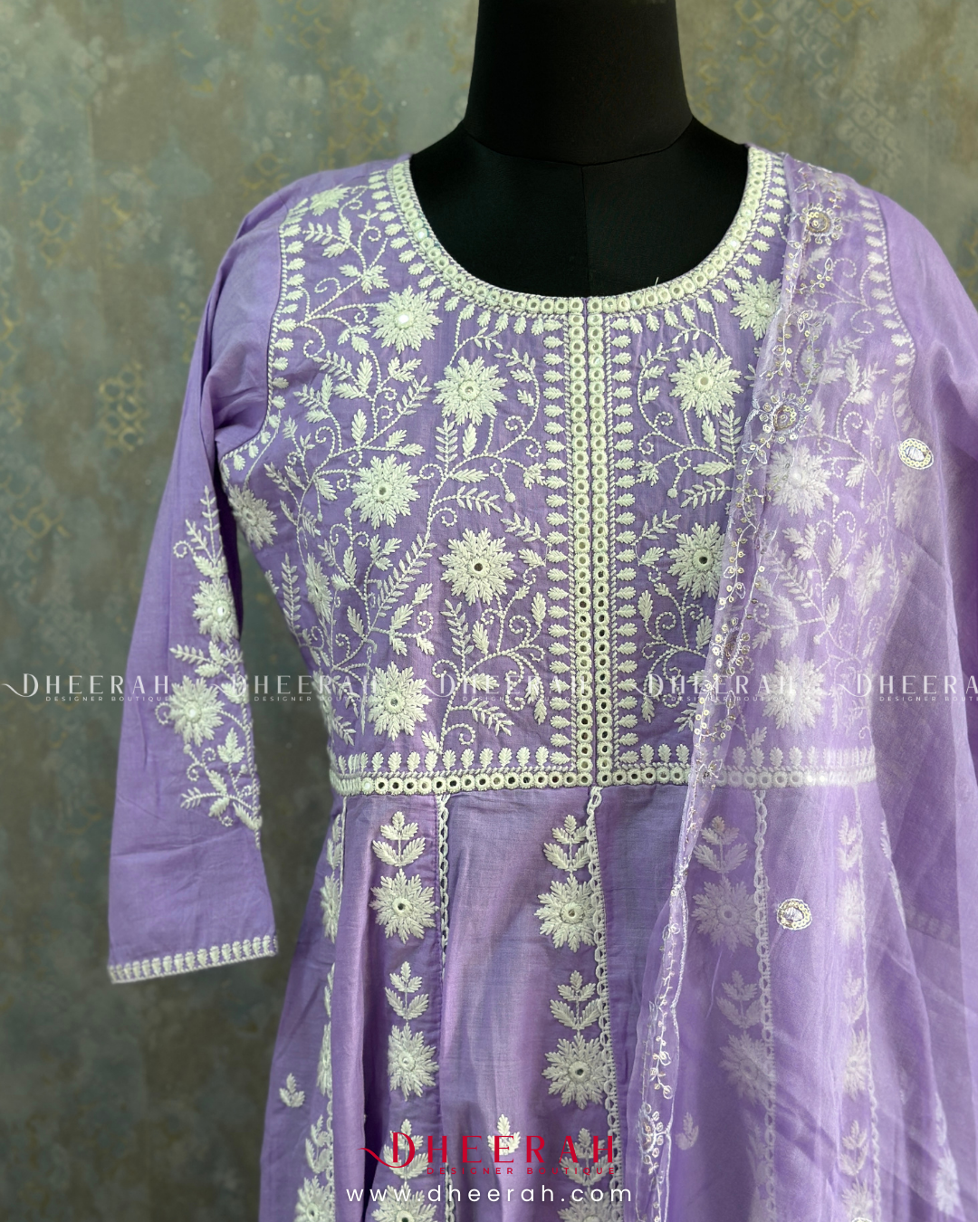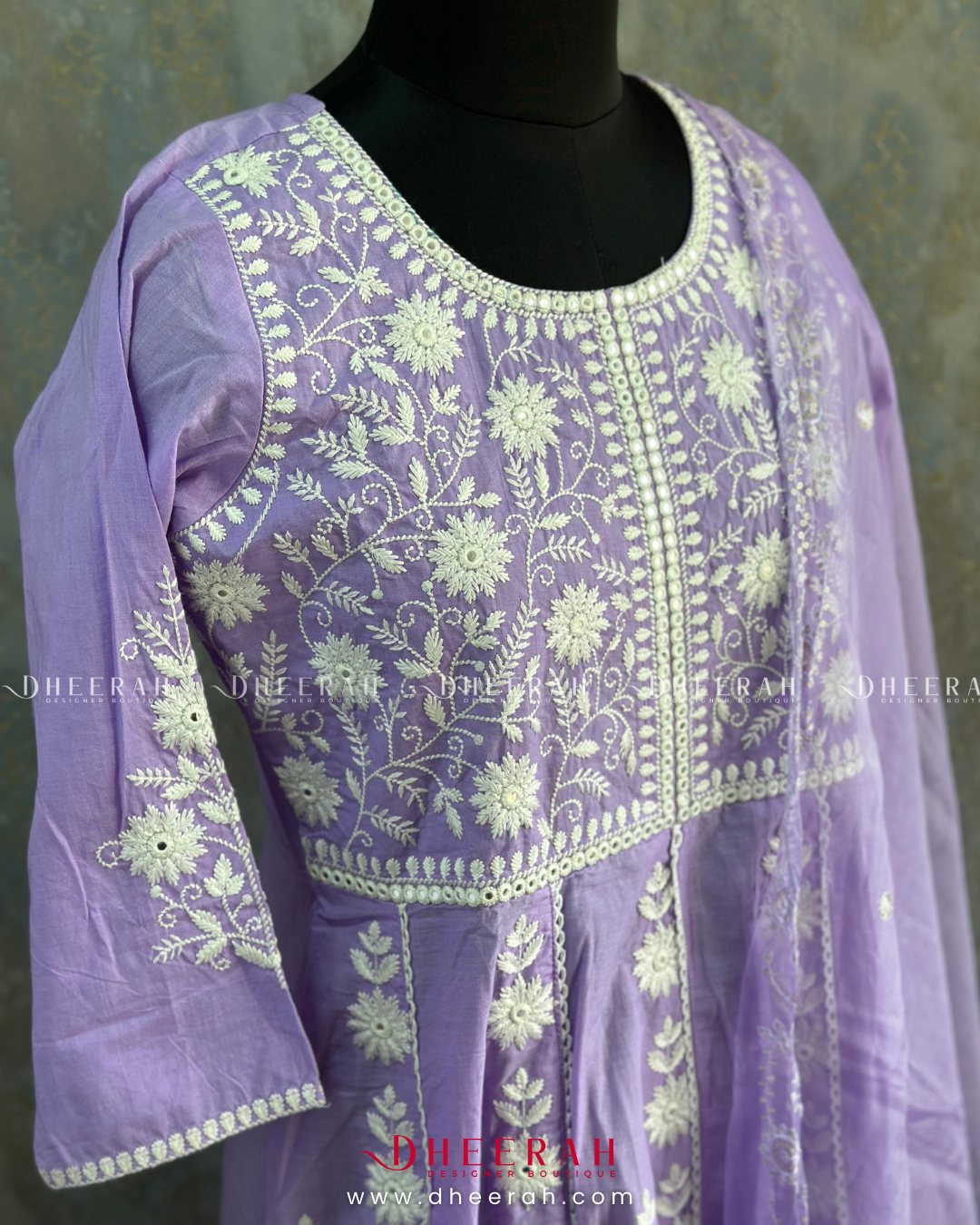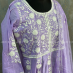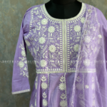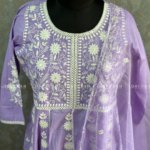 This pure cotton Anarkali features intricate chikankari work with a classic round neck, radiating grace and charm. The set includes plain cotton trousers and a beautifully handworked scallop-edged dupatta for a refined finish. A perfect blend of tradition and modernity, this ensemble from Dheerah Boutique is ideal for any occasion.