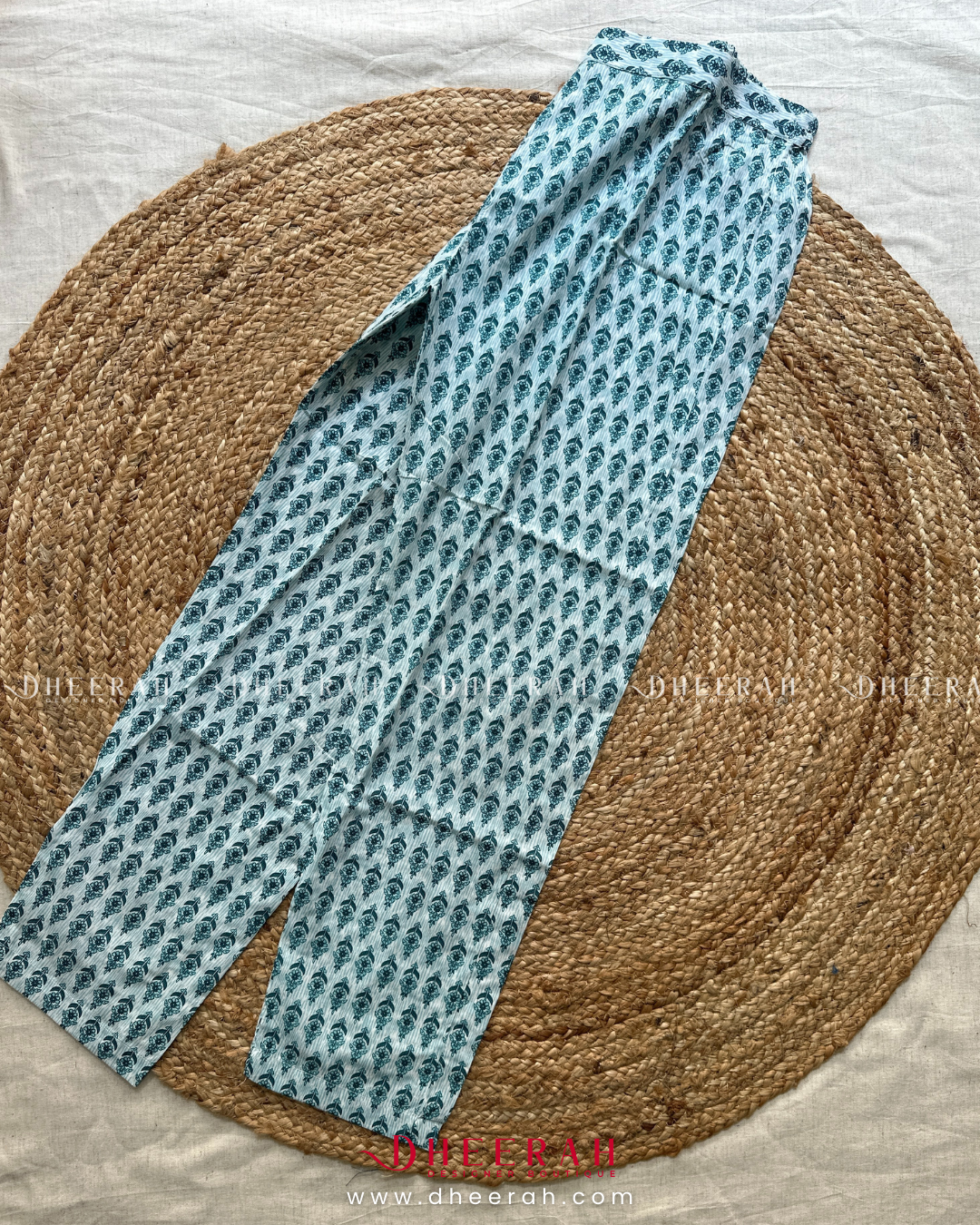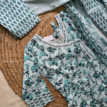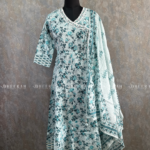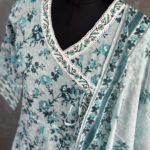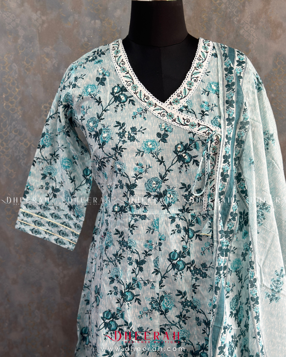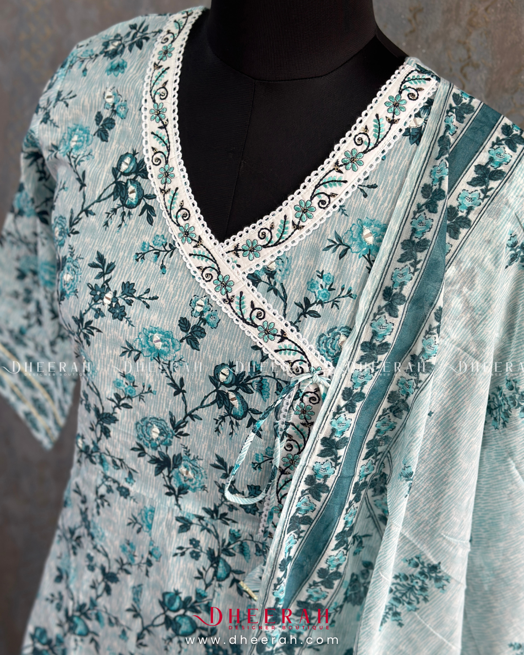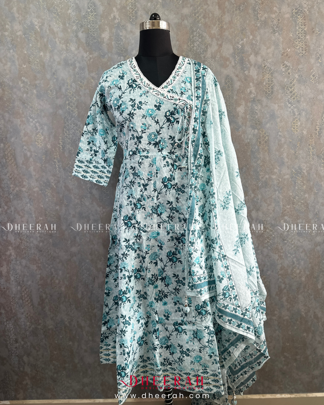 This pure cotton Angarakha-style Anarkali features intricate embroidery on the neckline, combining elegance with a touch of tradition. Paired with comfortable cotton trousers and a matching dupatta adorned with decorative hangings, this set exudes sophistication. A perfect choice for festive or special occasions, this ensemble from Dheerah Boutique is designed to make a statement.