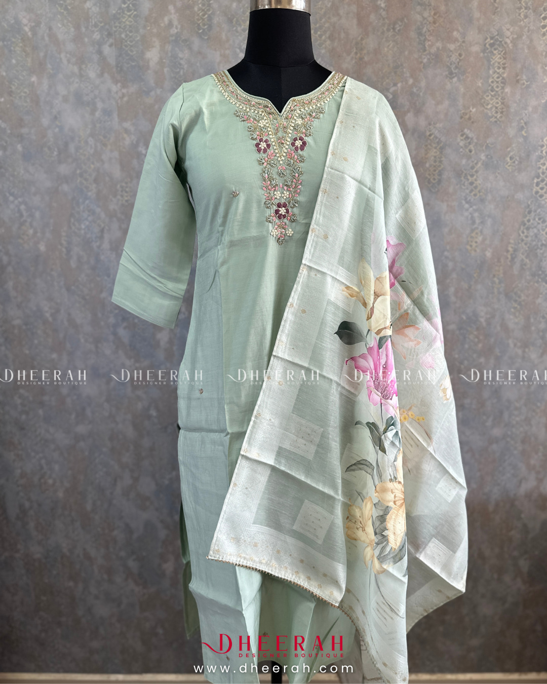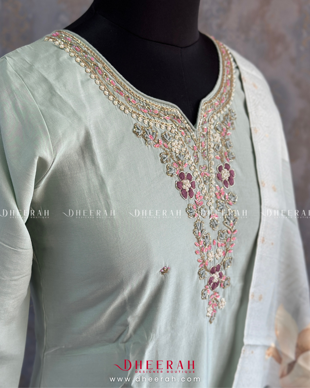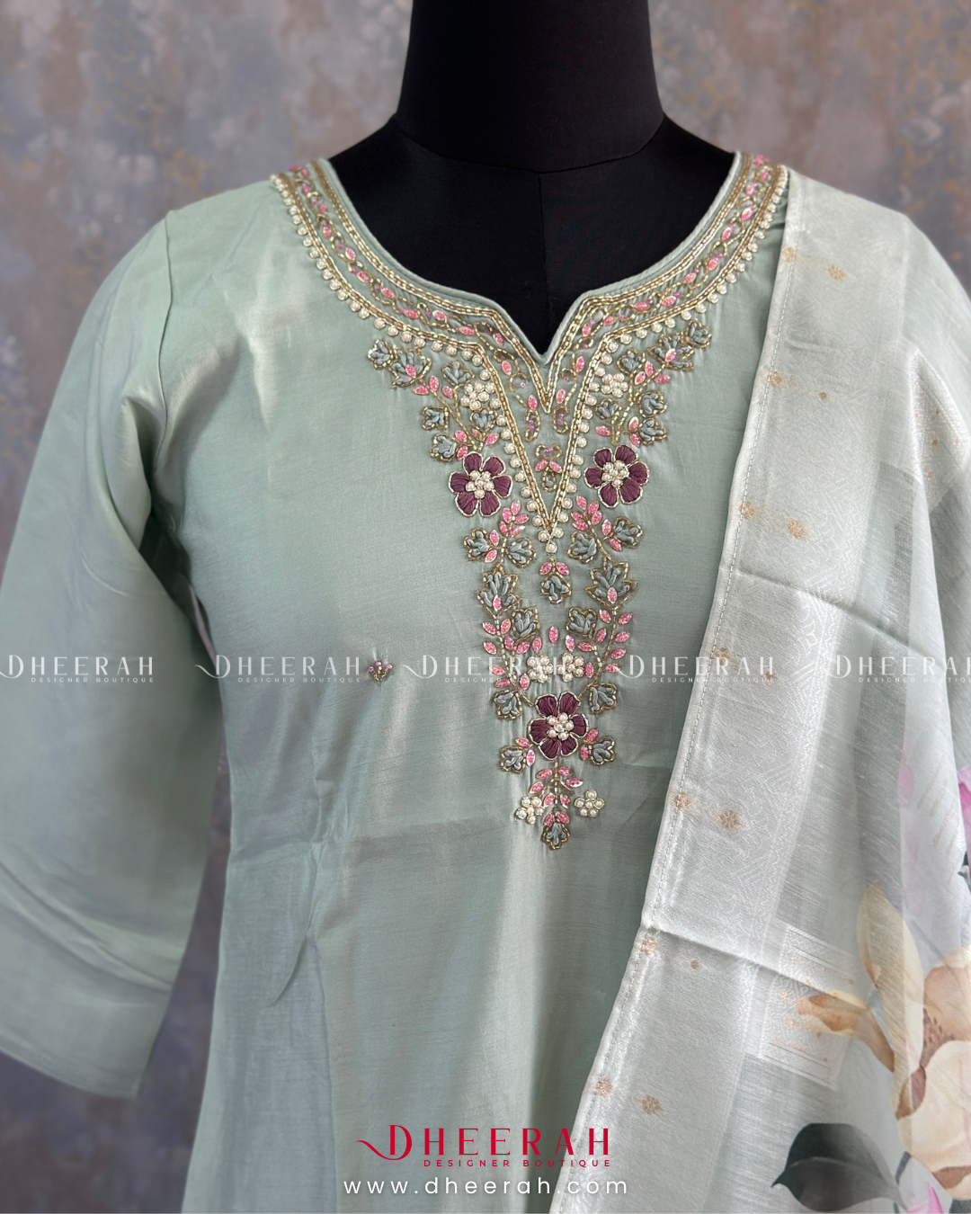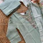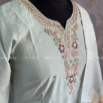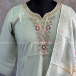 This pure muslin silk kurti features intricate heavy hand embroidery on the neckline for a luxurious finish. Paired with a soft organza digital printed dupatta and sleek silk trousers, it’s a perfect ensemble for a refined, elegant look.