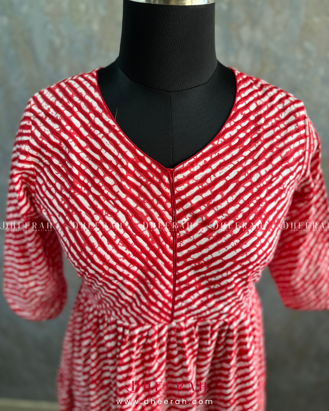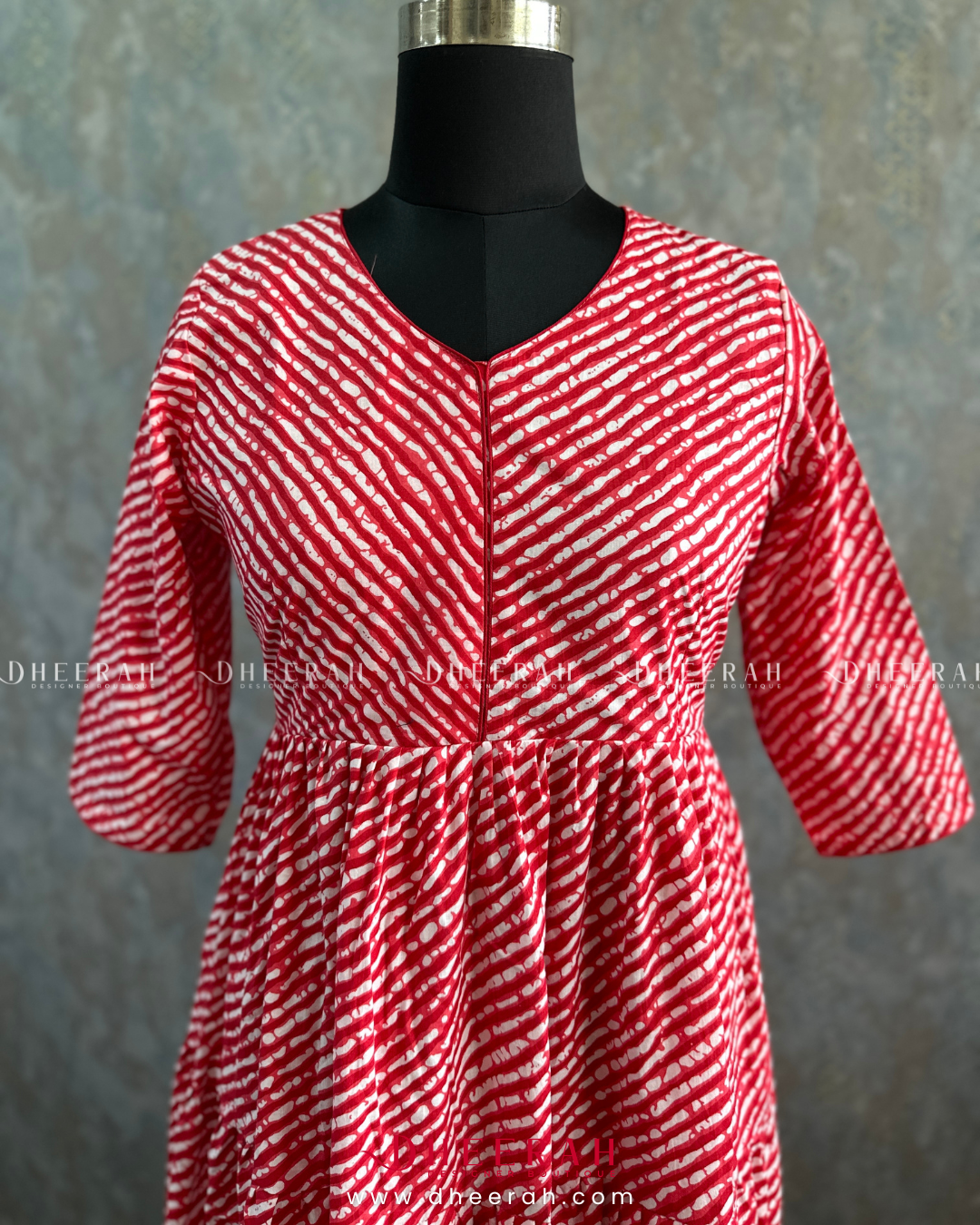 Red Leheriya Printed Cotton Gown, a perfect blend of tradition and style.