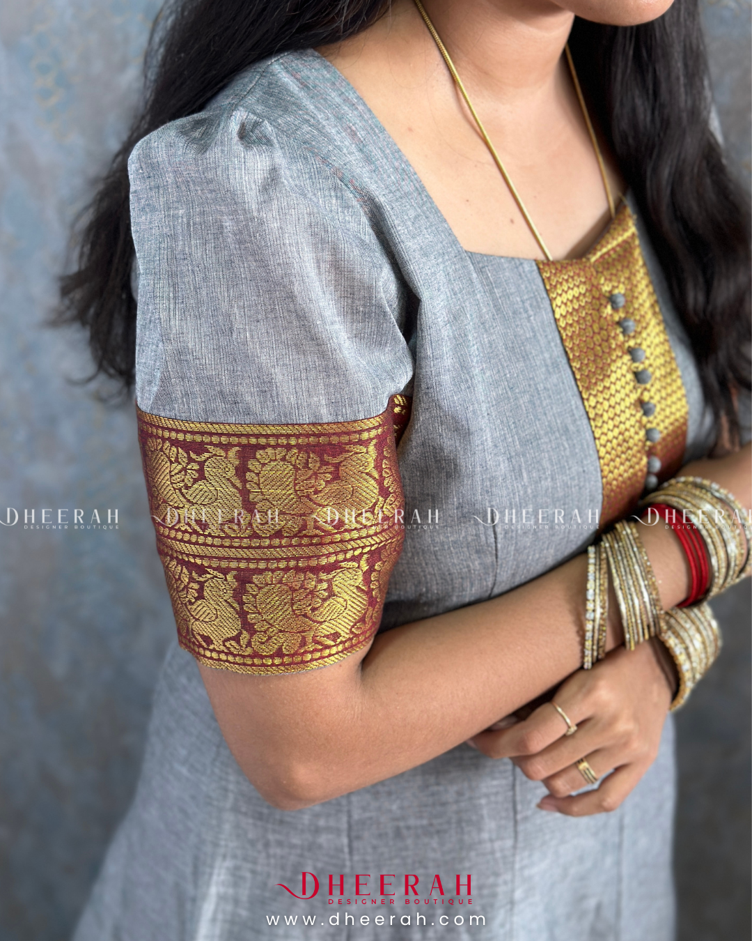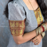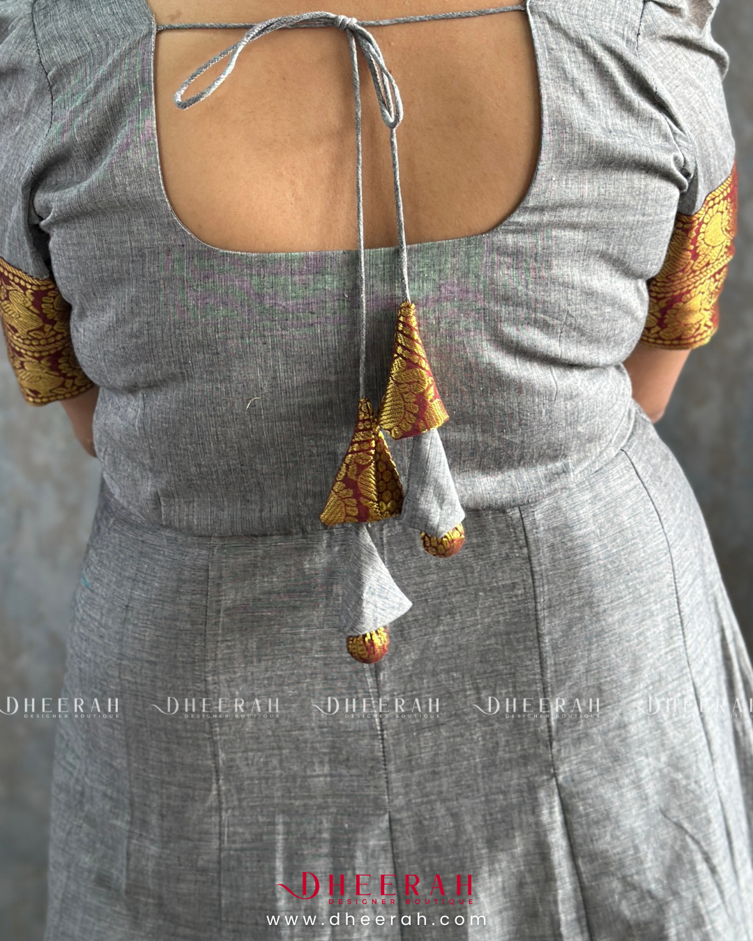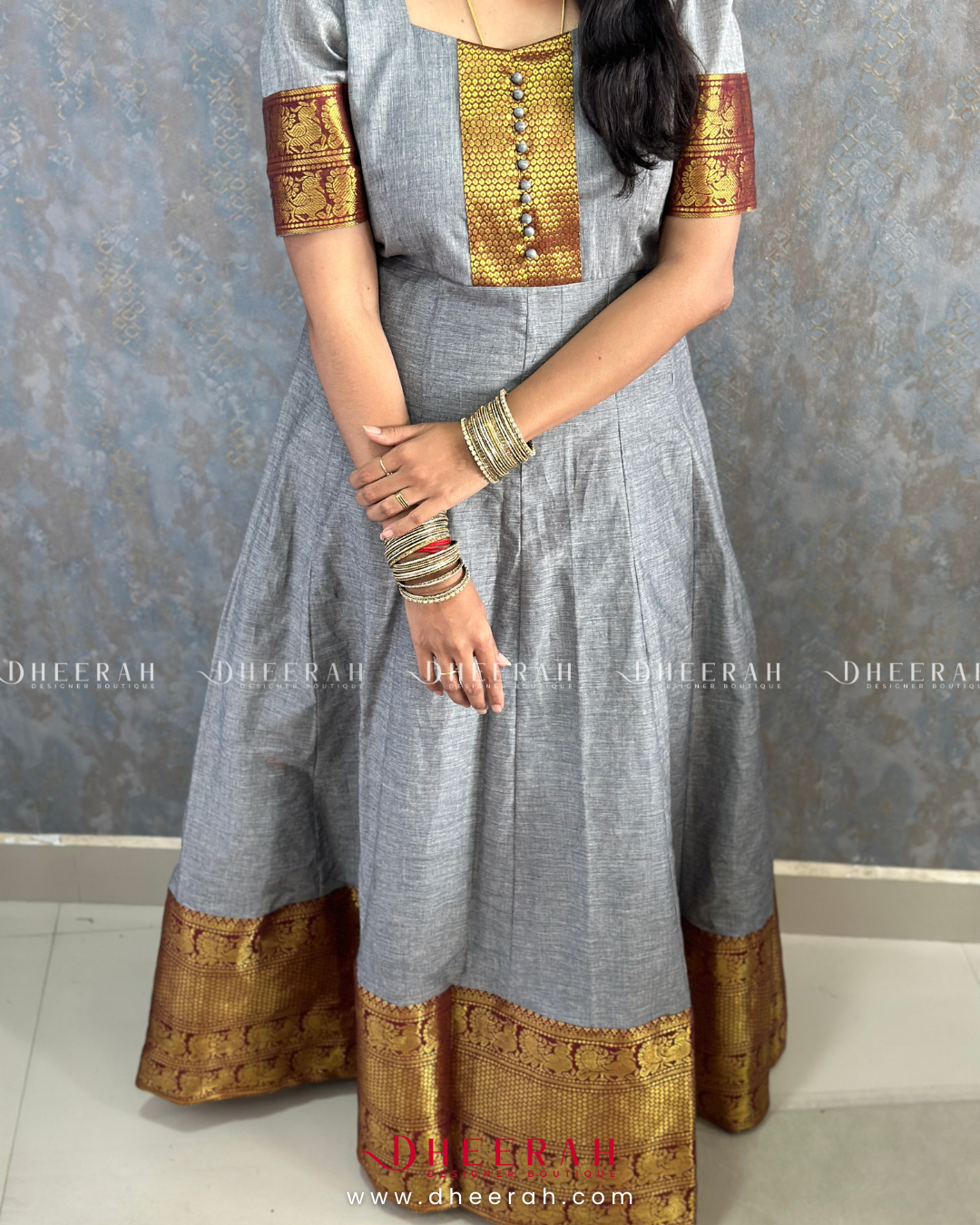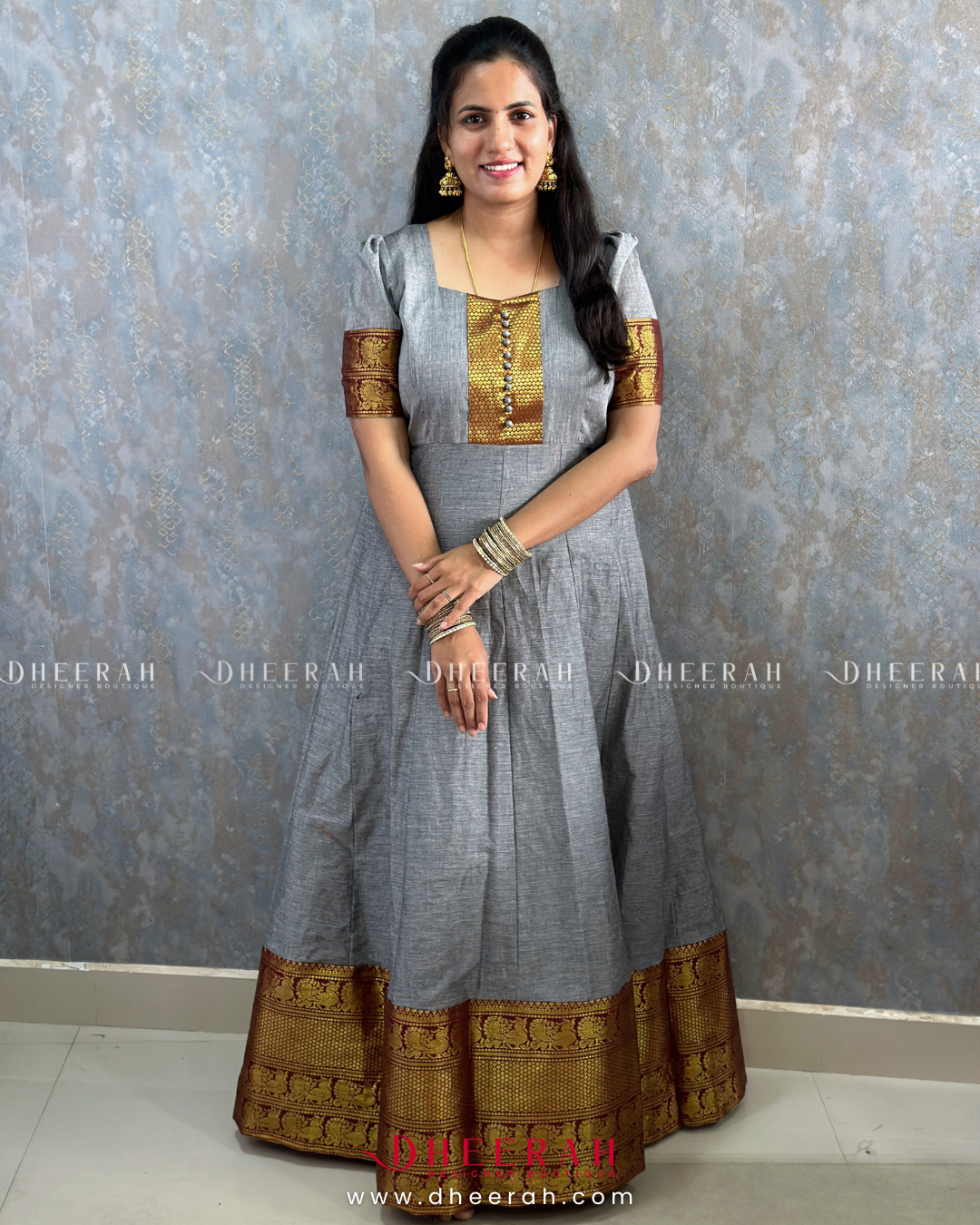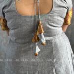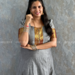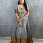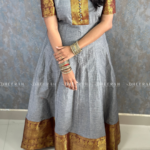 Charming Essence Anarkali Gown, crafted from pure South Chettinadu cotton. This stunning piece features airy puff sleeves that gracefully accentuate your shoulders and a beautifully embroidered yoke patch adorned with polti details.