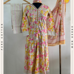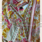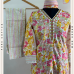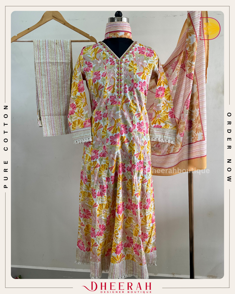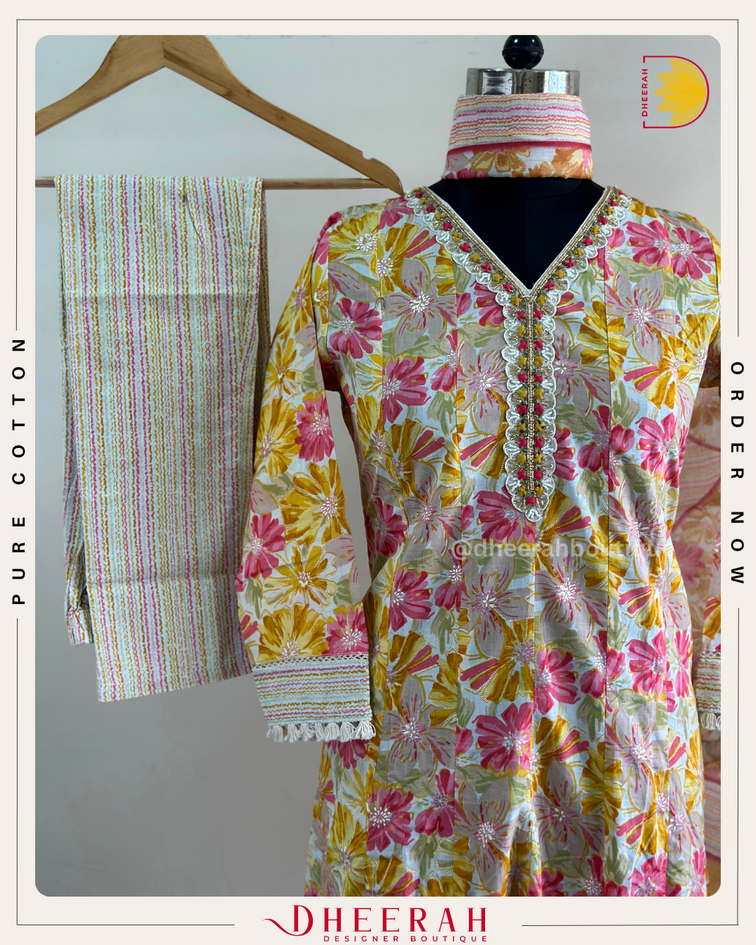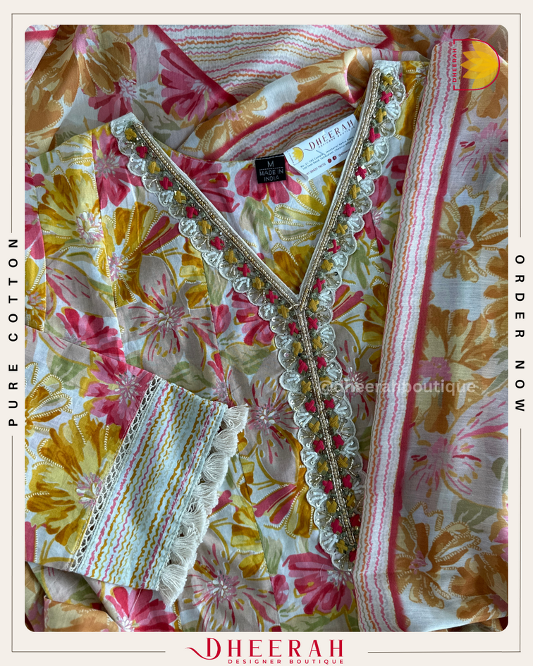 🦋 This premium cotton kurta features a stunning digital floral print with delicate hand & lace embroidery at the V-neck. ✨ Paired with comfy cotton pants and a matching digital printed dupatta, it’s perfect for any festive occasion. 🍃